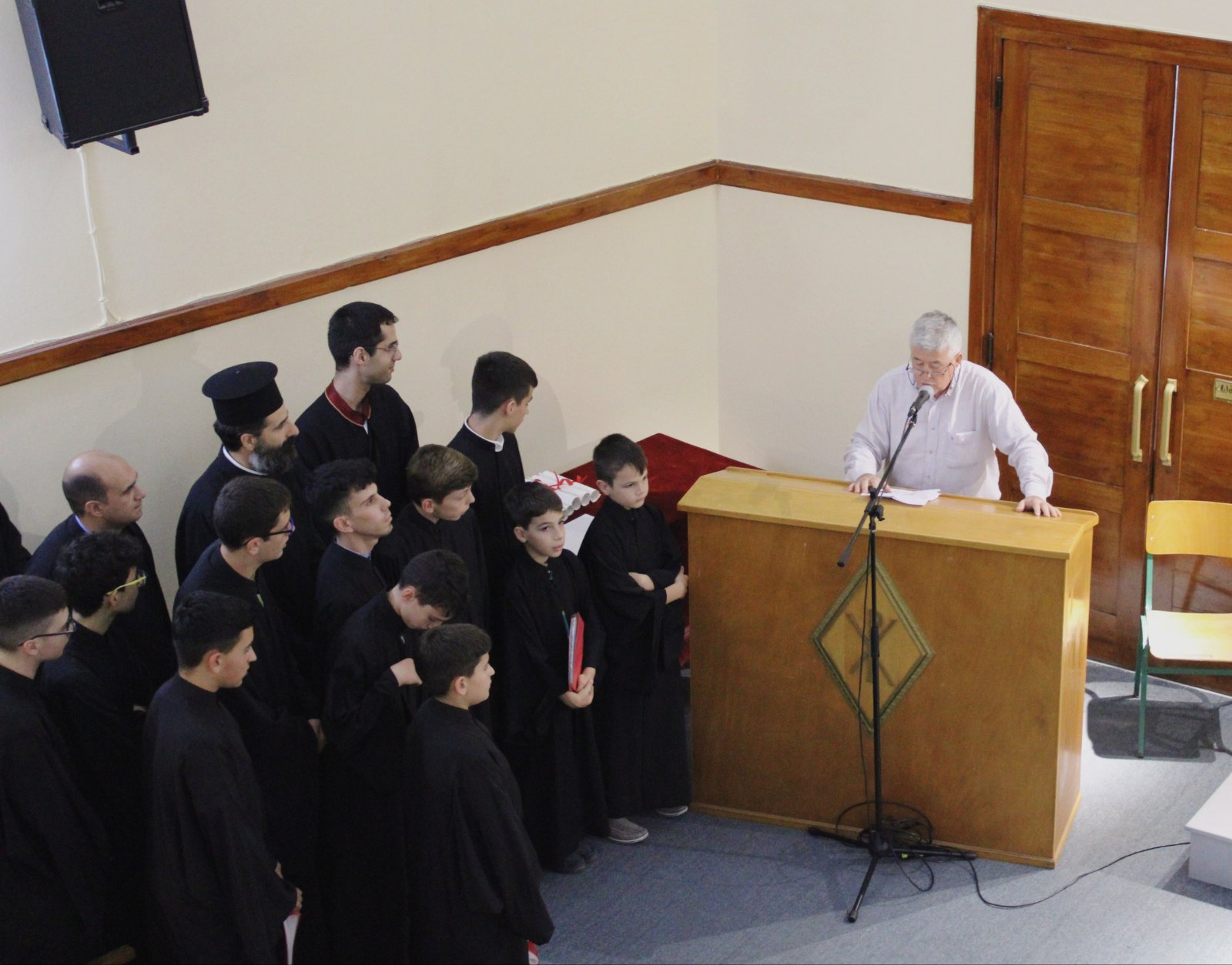 Ο καλλιτεχνικός διευθυντής της σχολής, κ. Γεώργιος Παπαγεωργίου, αναφέρθηκε διεξοδικά στους σκοπούς των εκδηλώσεων λήξης των μαθημάτων του σχολικού έτους, εξέφρασε την εγκάρδια ευγνωμοσύνη του σε όσους στηρίζουν το έργο της Σχολής, και πρώτα και κύρια, στον ακούραστο και φιλόμουσο Μητροπολίτη μας κ. Αθανάσιο, αλλά και στον π. Φιλάρετο, οι οποίοι μεριμνούν για την απρόσκοπτη λειτουργία της.