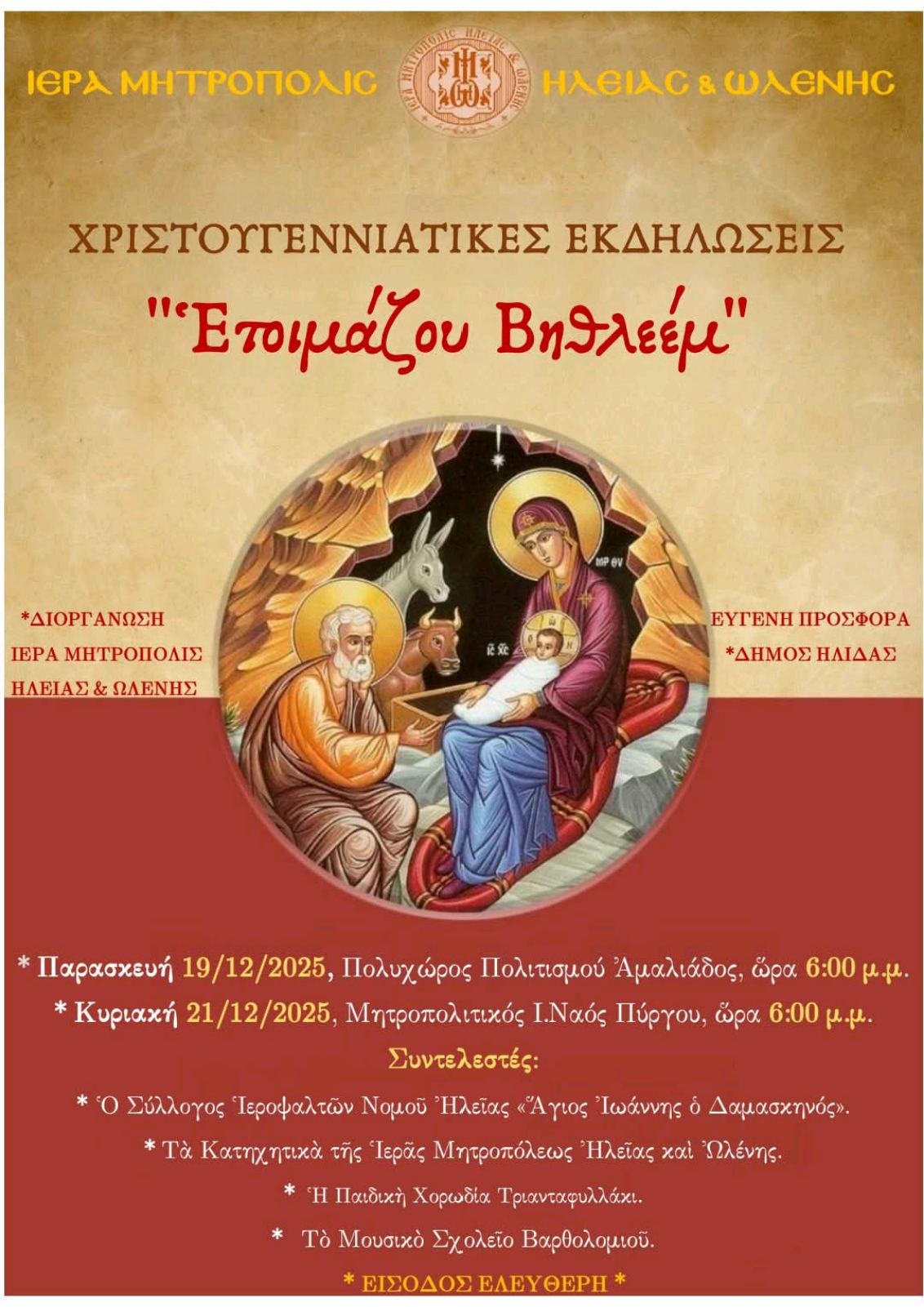 Η Ιερά Μητρόπολη Ηλείας και Ωλένης, στο πλαίσιο των Χριστουγεννιάτικων εκδηλώσεών της, προσκαλεί μικρούς και μεγάλους να συμμετάσχουν σε ένα πλούσιο εορταστικό πρόγραμμα με τίτλο «Ετοιμάζου Βηθλεέμ», αφιερωμένο στο πνεύμα των Χριστουγέννων.